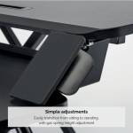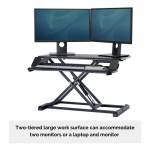 Fellowes Corsivo Sit-stand workstation is a cost-effective choice. Transform your sedentary desk into a dynamic sit-stand workstation and add movement to your working day to stay active and healthy. Easily transition from sitting to standing with gas spring height adjustment. Two-tiered larger work surface can accommodate flexible set up options, holding two monitors or a monitor and a laptop. Keep your phone or other accessories within easy reach with the convenient device channel. Black finish.