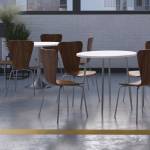 - This stylish and elegant bistro table has a modern, contemporary design and a smooth, round table top for multiple users. A long, chrome stem runs all the way down to a circular base for a sleek and durable finish. The glossy white top has a diameter of 800mm and wipes clean easily for quick and efficient cleaning.