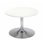 A sturdy low table with a walnut or white top and a chrome trumpet base