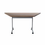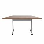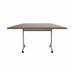 This economical mobile flip-top table has a hard-wearing MFC trapezoidal top and silver legs with black castors.