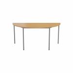- This semi-circular table, supplied in a flatpack construction is simple to build and is ideal for a variety of uses. Featuring 10mm height adjustable feet with metal to metal fixings, the table comes with a silver powder coated frame. Finished in Nova Oak, measuring 1600x800x730mm.