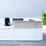 This Jemini Reception Modular Corner Desk Unit can be used in conjunction with other modules to create a reception unit that suits you. This Corner Desk Unit features a built-in modesty board, 25mm thick desktop and with levelling feet. Designed to complement the entire Jemini furniture range.