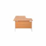 Suitable for use in a variety of office environments. This Jemini Cantilever Desk features double upright legs for improved stability, with height adjustable feet up to 10mm. The radial design offers easy working access to your computer, as well as ample additional desktop space. The 25mm thick MFC desktop features 2mm edge banding and 80mm dual cable management ports. The desk includes a modesty panel as standard and is suitable for use with Jemini Fixed Pedestals on the 800mm end.