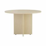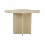 - This beautifully constructed oak veneer table with round table top is suitable for the office and the home, and makes a great, informal meeting area. A cruciform base provides stability for long lasting, extended use. In addition, an easy to clean surface allows you to clean up after use with consummate ease. The diameter of the table is 1100mm and it is 730mm high.