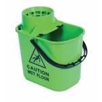 - Constructed of robust polypropylene, this mop bucket is strong enough for frequent use when mopping and cleaning. It features a plastic sieve-style wringer for wrenching used water out of your mop, with a channel to carry excess water away to prevent drips. On the side of the bucket, a clear anti-slip warning sign is printed. This pack contains one 15 litre mop bucket with wringer in green, for colour coordinated cleaning.