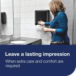 Comfort your guests with the Advanced Tork Matic® soft hand towel roll. Ideal for hand drying with a grey leaf decor embossing. The rolls are suitable for the Tork Matic® Hand Towel Roll Dispenser, developed for easy maintenance in high traffic washrooms. It saves time and controls consumption with one-at-a-time sheet dispensing.