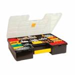 The Stanley Sortmaster organiser has removable dividers allowing for combination of tools and small parts storage. The lid has a special structure where the upper ribs interlock with inner dividers to keep small parts in place and prevent movement from one compartment to another. The unique angled corners accommodate angled tools such as hammers. The organiser measures 43x9x33cm in size and when empty weighs 1.065kg.