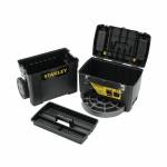 - The Stanley 2 In 1 Rolling Workshop is perfect for everyday storage. The mobile workshop can separate in seconds into 2 units. There is an extra large tool box with removable tote tray for maximum volume utility. While the giant lower bin is ideal for bulky materials and equipment, the swivel front drawer (carousel) and lid organiser is for small parts. The unit has nickel plated metal latches, telescopic handle and heavy duty road tested wheels. Fold the handle down and the rolling workshop conveniently fits into your car.